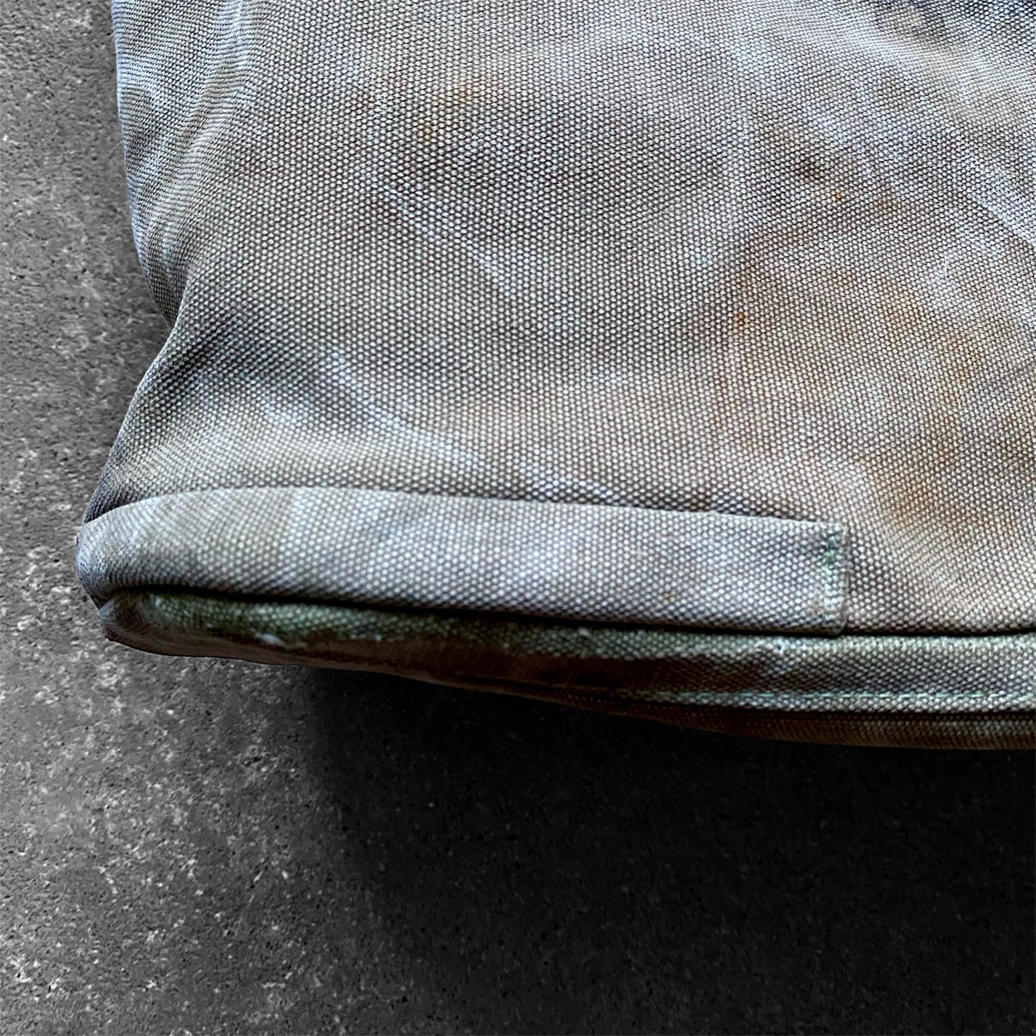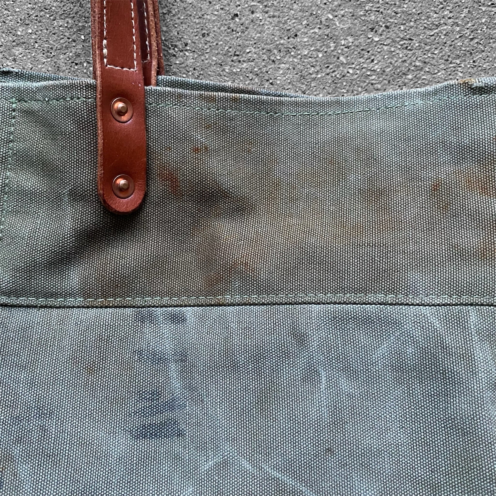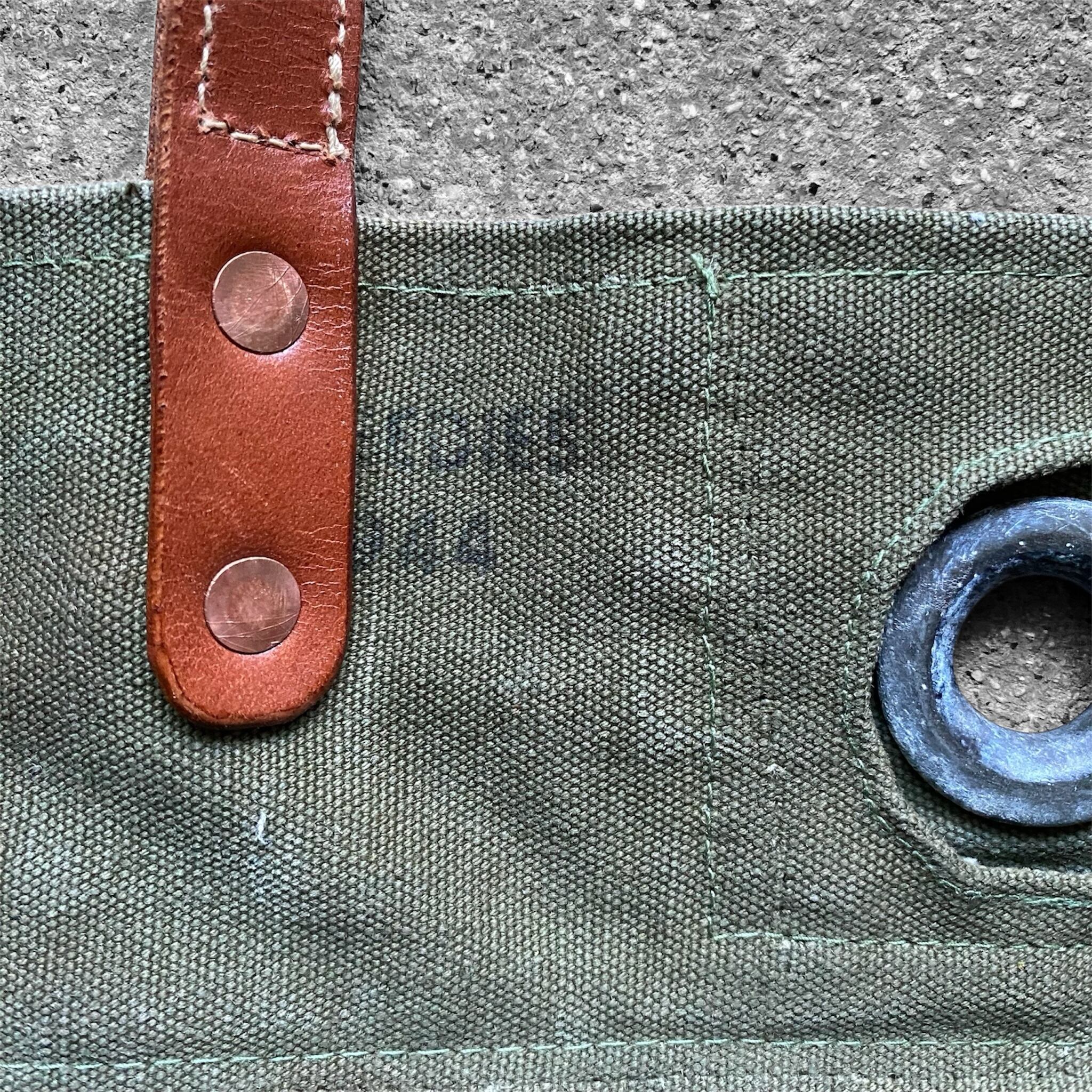 ④ヴィンテージならではの個性:カバンには多数のステンシル、サビ跡、黒い汚れや油汚れなどが残っており、これらを 特別なデザインの一部として活かしています。唯一無二の表情が楽しめるポイントです。